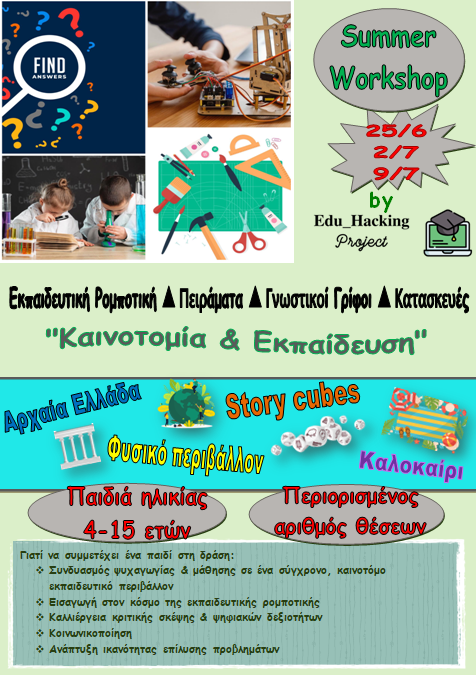 Δώστε την ευκαιρία στο παιδί σας να ζήσει μοναδικές εμπειρίες καλλιεργώντας και ανακαλύπτοντας τις ικανότητές του μέσω της εκπαιδευτικής ρομποτικής, των πειραμάτων, των γνωστικών γρίφων, των κατασκευών αλλά και να διασκεδάσει δημιουργώντας τις πιο αστείες και ευφάν ταστες ιστορίες.